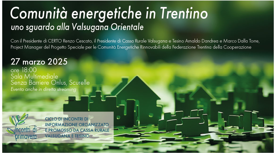 Giovedì 27 marzo, a partire dalle 18:00, presso la sala multimediale della Senza Barriere Onlus a Scurelle e in diretta streaming, avrà luogo il secondo appuntamento degli "Incontri di Primavera", un’occasione imperdibile per esplorare un tema cruciale per il futuro del nostro territorio.